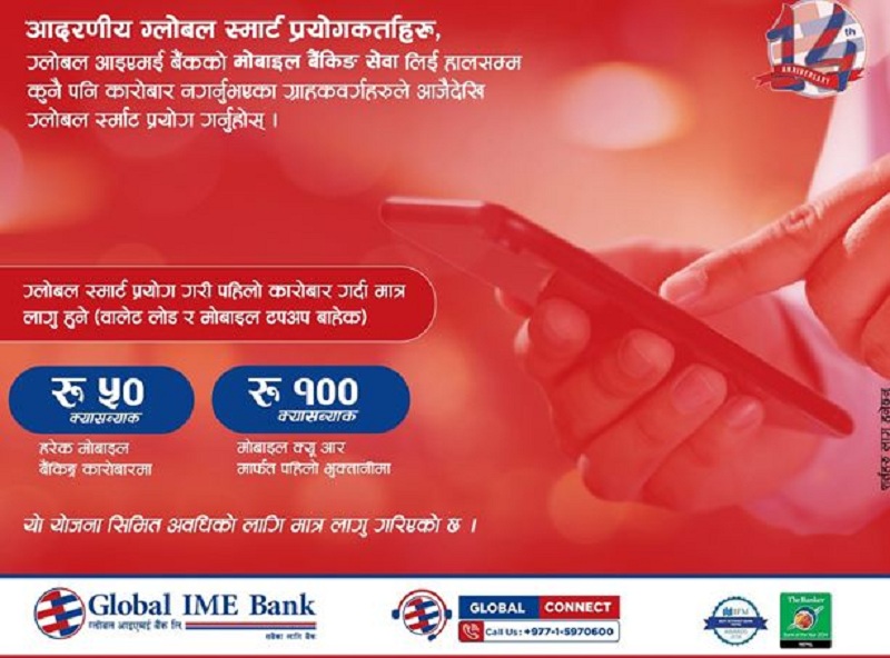 ग्लोबल आइएमई बैंकले बैंकको ‘मोबाइल बैकिङ्ग तथा ग्लोबल स्मार्ट’ सेवामा क्यासब्याक योजना सार्वजनिक गरेको छ ।