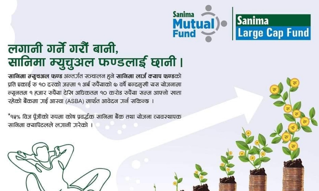 सानिमा बैंकअन्तर्गतको सानिमा म्युचुअल फण्डले आजबाट नयाँ इकाइ सानिमा लार्ज क्याप फण्ड जारी गरेको छ ।