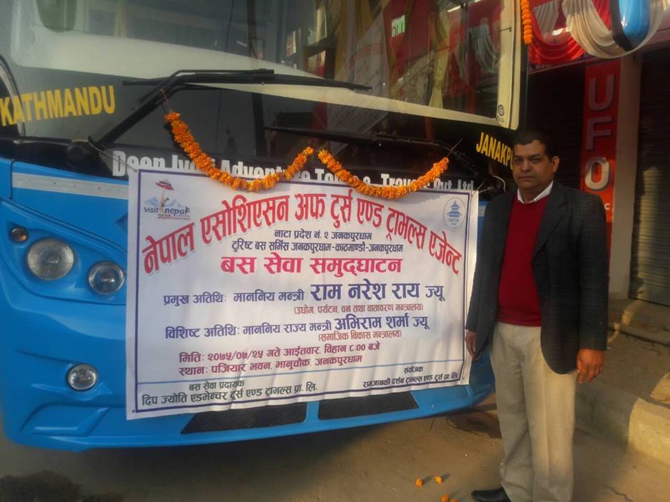 दिपज्योति एड्भेञ्चर टुर्स एण्ड ट्राभल्स प्रा.लि.ले काठमाडौं–जनकपुरधाम पर्यटक बस सेवा सञ्चालनमा ल्याएको छ । यसअघि दिपज्योति ट्राभल्सले काठमाडौं–पोखरा बस सेवा सञ्चालन गर्दै आएको थियो ।